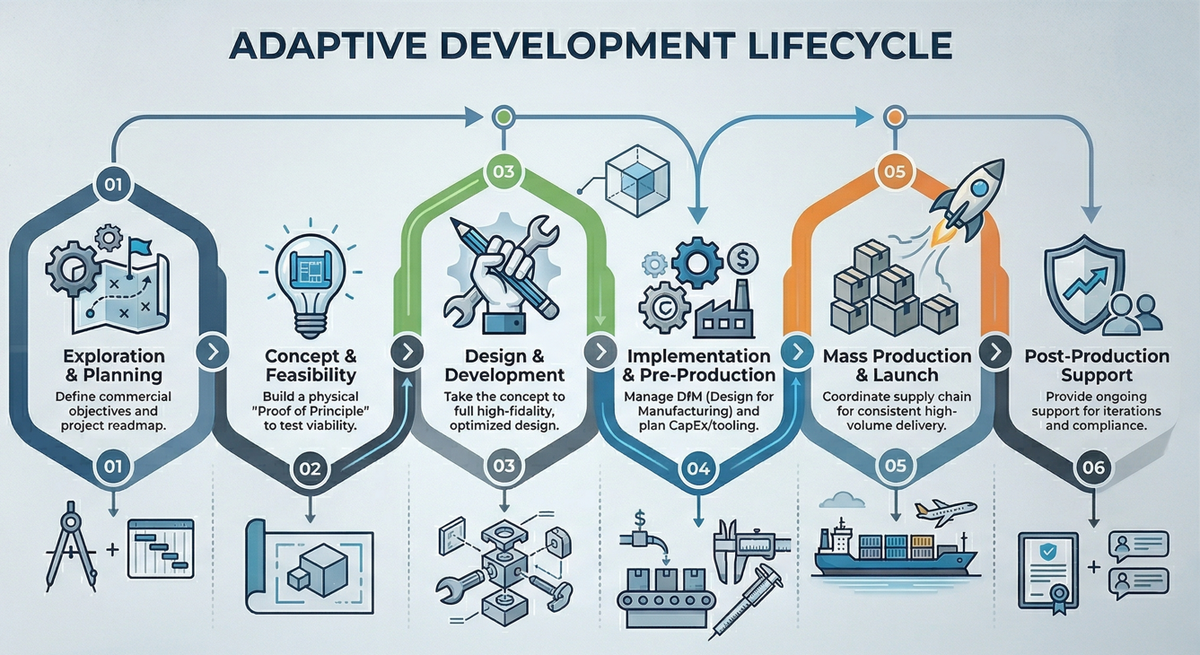 From initial proof-of-concept through to high-volume manufacturing and post-market support, we align our delivery with your specific goals, timelines, and investment requirements.